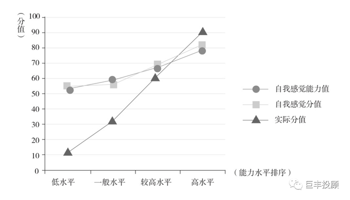 没有人会觉得自己连中等水平都达不到,因此他们会夸大对自我能力的评价,当一个人觉得别人比自己更无知的时候,他的感觉会好很多。这会导致一种错觉,即自己属于能力偏上的人,哪怕实际上他们的表现属于最差的那10%。