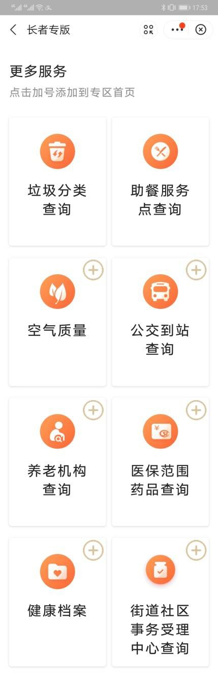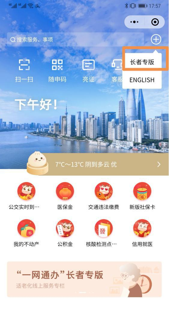 2、点击首页腰部【“一网通办” 长者专版】图片,进入长者专版。或者通过右上角的“+”进行版本切换,选择“长者专版”。