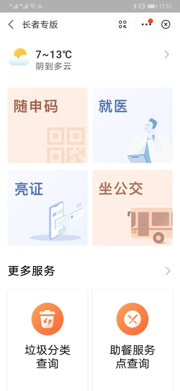 “长者专版”根据老年人的需求习惯,从放大、配色方面着手,采用大图标、大字体、高对比度的设计风格,打造适老化无障碍版本,提升老年人使用体验。视觉设计重塑不仅体现在“长者专版”首页面,同步对相应服务的二级页面进行字体、布局调整。新版本中,还将天气预报直接在页面显著位置,便于常用服务更加简单和直观的查看。