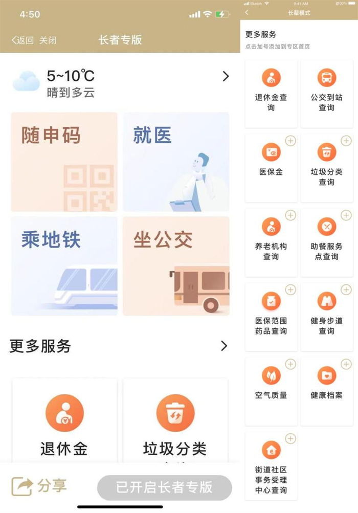 “长者专版”的常用服务选取了出行、就医等最常用场景,主推随申码、医疗付费“一件事”、公交码、地铁码、亮证四项服务,在页面显著位置予以展现,便于老年人直达常用服务。“便民服务”版块前期是默认天气预报、公交到站查询两个常用功能,新版本中增加了更多适合老年人使用的服务,同时支持用户自定义管理最常用的两个服务,最常用的服务可自行管理和灵活调整。“每周科普”版块则为提供老年人当季健康知识科普。
