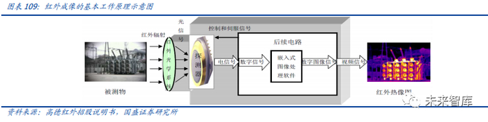 红外产业链包括镜头、红外探测器、信号处理模块及红外系统整机等:其中红外探测器 是最核心的部件,它可以将光信号变成微弱的电信号,其性能直接决定了红外成像的分 辨率和灵敏度;信号处理模块可以针对探测器输出的电信号进行处理和数字化采样,经 过图像处理后,最终将目标物体的温度分布图转换为视频图像;将红外探测器、信号处 理模块与光学镜头、电池、外壳等结构件整合形成红外整机。