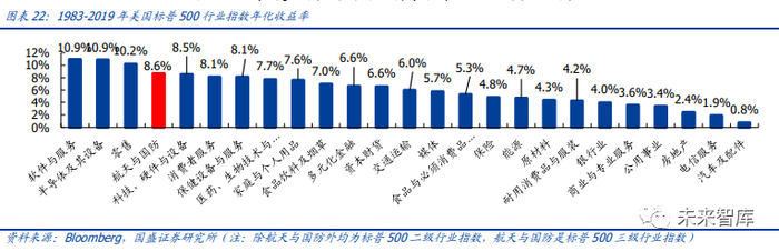 2)促进国防实力和经济实力同步提升。我们认为,一个大体量的经济体需要强大的国防 力量来与之匹配,与之相匹配的是军工产业的长足发展。以美国为例,1981 年里根出任 美国总统,提出了对内振兴经济,对外重振国威的口号。开始对苏联采取强硬态度,遏 制苏联在全球的扩张势力。在核战略和核军备方面,美国提出了“星球大战计划”,通过 以高技术为核心的新一轮军备竞赛,从而拖垮经济力量相对落后的苏联。美国经济与国 防同步发展的结果是,美股军工行业过去 40 年年化收益率位列各板块前列,未来我国 国防与经济同步发展的同时亦将带动军工企业的长足发展。