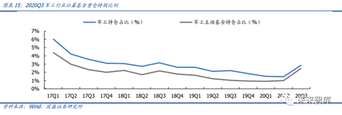 针对国盛军工 158 个军工标的,我们测算下来公募基金与 2020Q3 机构重仓持股比例 (2.87%,环比+1.4pct),从趋势上来看 2020Q2 开始机构开始逐步加仓军工,但仍有 很大提升空间。