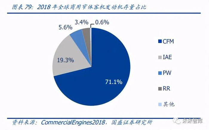 从全球竞争格局来看,在全球商用航空发动机领域中,我国商用航空发动机 CJ-1000A 目前还在研制阶段,尚未在全球商用航发领域有一席之地。目前全球在产宽体客机主要 选配了 GE 公司的 GE90、GE9X 和 GEnx 发动机和 RR 公司的 Trent 系列发动机;而几乎 所有在产窄体客机都选配了 CFM 国际的 CFM56 或 LEAP 系列发动机。