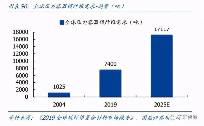 目前,碳纤维在风电叶片、压力容器等新兴领域的需求正在迅猛增长。1)风电叶片,低 风速风场和海上风电共同推进了叶片的大型化发展,进一步推动碳纤维在风电领域持续 高速增长;2)压力容器,主要是燃料电池所需的氢气瓶,是 2019 年及未来的热点。氢 气瓶的外层缠绕,可能会对碳纤维及其复合材料产生一个革命性的影响。从用量上来看, 一款 50 万台的燃料汽车就需要大约 30000 吨碳纤维,3 款汽车就能消耗掉 2018 年全球 的碳纤维需求
