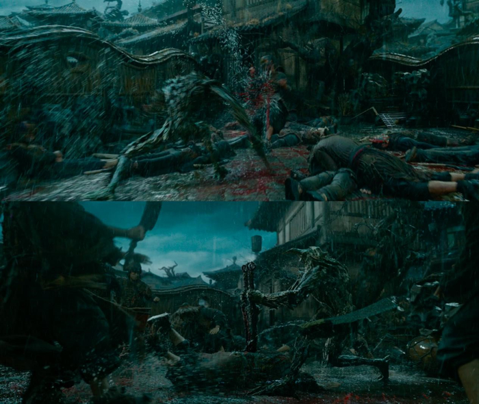 因此,电影首先让人啧啧称奇的是,它的特效的确达到国产奇幻电影的一流水平,肉眼可见砸了大量的钱,也投入大量的人力物力。无论是异世界里的吸血黑甲、红甲武士、赤发鬼,还是几场大场面大阵仗的打斗,特效的细节充满质感,视听感受很震撼。
