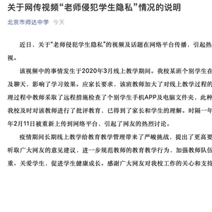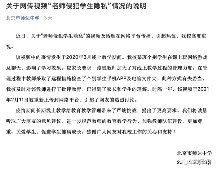 北京市师达中学表示,该视频中的事情发生于2020年3月线上教学期间。我校某班个别学生在课上玩网络游戏及聊天,影响了学习效果。应家长要求,该班教师加大了对线上教学过程的管理力度。在管理过程中教师采取了远程措施检查了个别学生手机APP及电脑文件夹,此种方式有失妥当,我校及时对该教师进行了批评教育,已得到了家长和学生的理解。时隔一年,该视频于2021年2月11日被重新上传到网络平台,引起了网友的热烈讨论。