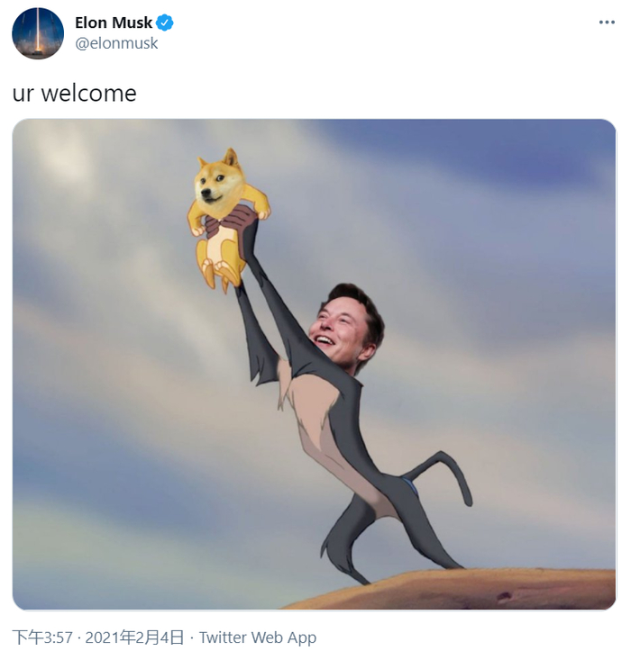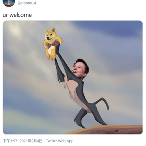 2月4日,马斯克在推特上表示:“狗狗币是人民的货币。”并且发了一张狮子王的配图,把狮子王辛巴的头换成了狗头。韩当入手时,狗狗币的价格还在1分钱左右,而目前价格为0.47元/个。炒币多年,无心插柳,这成为他遭遇的第一个10倍币。