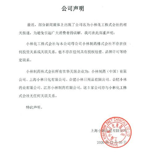 小林制药在声明中称,小林化工株式会社与本公司母公司小林制药株式会社不存在任何投资关系或关联关系,也不存在任何具有授权经营、品牌许可等特定联系。