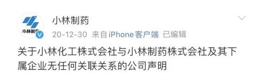 早在2020年年底,小林制药就已经发出声明,向中国用户解释具体情况:涉事日企小林化工与小林制药及其下属企业无任何关联关系。