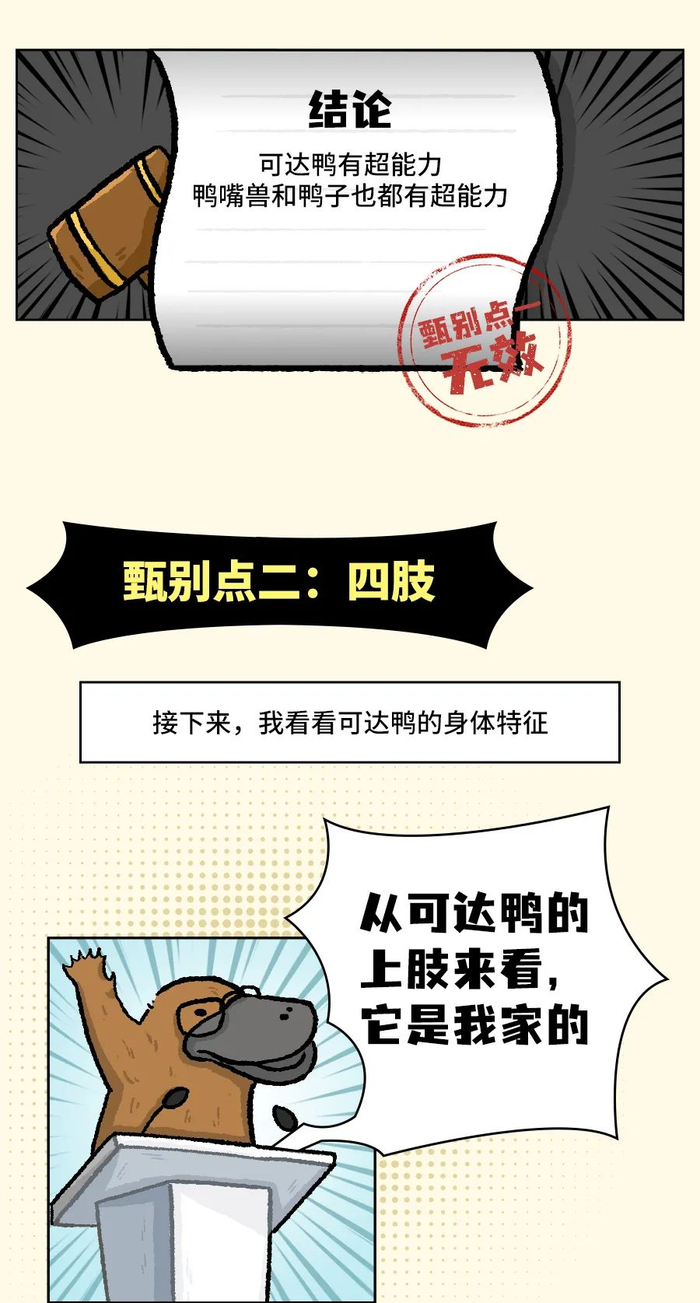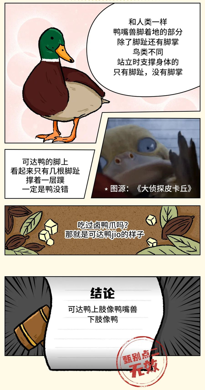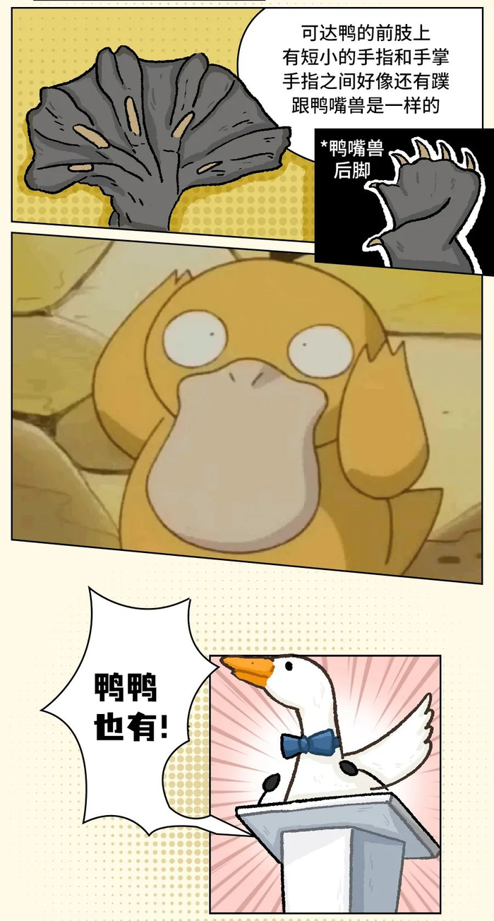再比如四肢——虽然可达鸭长了一双鸭脚,但可达鸭的手跟鸭嘴兽是一模一样的;
