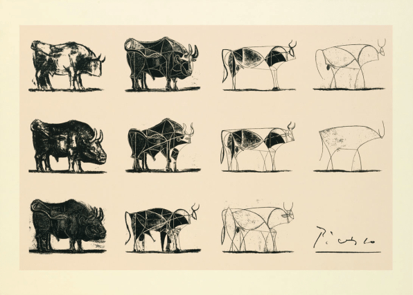 西班牙无疑是另一个与牛有着渊源的国家,在那里出生的毕加索就钟爱牛——他是斗牛场的常客。在一组作于1945年至1946年间的绘画中,这位艺术家用牛展现了自己艺术风格与想法的演变。他画了11幅《公牛图》,牛的形象从具象逐渐走向抽象的线条。毕加索将公牛视为重要的隐喻,取决于具体语境,它们有时候代表着西班牙人民,有时候表达了对于法西斯主义与暴力的看法,有时候意味着男性的生殖力,有时候则映射着艺术家的自我形象。