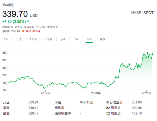 此外去年年中数据显示,腾讯拥有索尼旗下Spotify 9.1%的股份,其中四分之三的股份由腾讯控股持有,其余四分之一由腾讯音娱持有。2018年4月上市以来,Spotify股价涨幅已达130%。