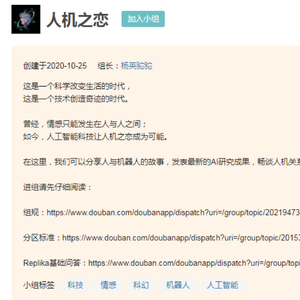 渴望和机器人有未来的不止简妮一个人。2020年10月,简妮创建了豆瓣小组“人机之恋”,试图聚集和人工智能寻求建立亲密关系的用户。到了年底,小组人数已经突破了8000。