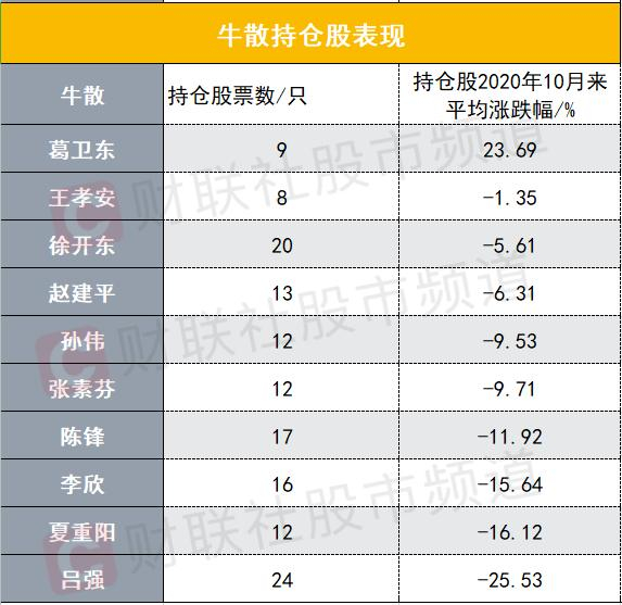 从持仓股2020年10月以来表现看,牛散也是把“抱团”行情体现的淋漓尽致,十大牛散中竟只有葛卫东赚钱,2020年10月以来持仓股平均涨幅达23.69%,不过也并未跑赢创业板指,此外,规模仅次于葛卫东的王孝安微跌1.35%。值得注意的是,持股分散最为劣势,陈锋、李欣等跌幅均在10%以上,其中吕强跌幅高达25.53%。