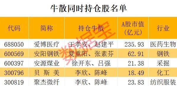 从上述十大牛散交叉持股的情况看,爱博医疗、安阳钢铁、安源煤业、贝斯美、聚杰微纤等5股获2名牛散共同持仓。如爱博医疗,牛散王孝安、赵建平分别持仓该股1.44亿元、0.6亿元;李欣和陈峰共同持有贝斯美、聚杰微纤2只股票;夏重阳、张素芬共同持有安阳钢铁;徐开东、吕强共同持有安源煤业。