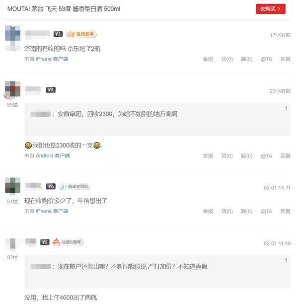 在购物参考网站关于茅台的评论区,上百条留言里没有人谈论酒质没有人评价口感,只有抢到酒的人们在探讨行情,宛如黄牛交易市场。