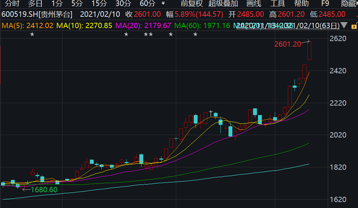 鼠年最后一个交易日,贵州茅台股价先后站上2500元、2600元/股,续创历史新高。截至2月10日收盘,贵州茅台股价上涨5.89%,报2601.00元/股,总市值32673.70亿元。在过去的12个月中,茅台股价增加了一倍以上,自2021年初以来增长了30%以上。