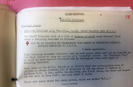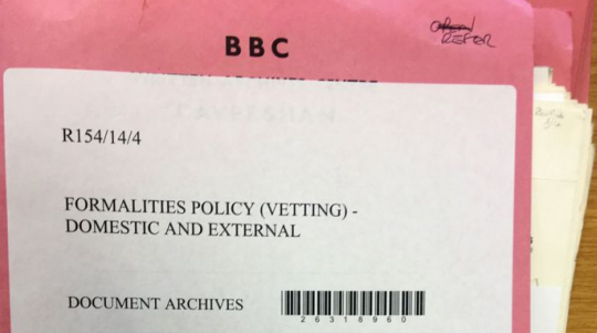 BBC新闻网站2018年4月21日在一篇有关冷战的报道中披露,英国军情五处曾经在长达几十年的时间里,对于BBC所有员工进行入职审查,一些非常著名的媒体人曾经因为审查不过关被拒入职。下图这些粉色档案,有的还带有一些奇怪的符号,就是这类审查的明证。