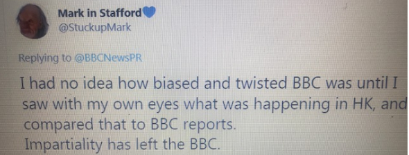 网友Mark说:“当我亲眼看到在香港发生的一切,并且把它和BBC的报道做比较,我无法形容BBC有关香港的报道带有多么大的偏见和扭曲。”
