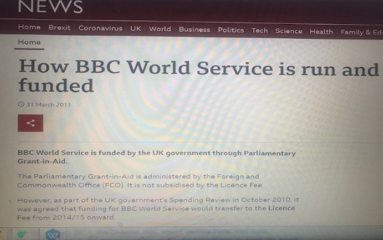 2011年,BBC新闻网站曾专门介绍,维持BBC国际频道运转的主要资金来源是英国外交部,以议会政府补助金的名义发放,不直接花费英国纳税人缴纳的电视税。过去五年,根据BBC国际频道16页纸的运营许可,其每年基本经费保障至少在2.54亿英镑。本来,BBC国际频道作为英国政府的喉舌和对外宣传媒体的身份人人皆知,它使用英国外交部直接拨款也不是一个秘密。