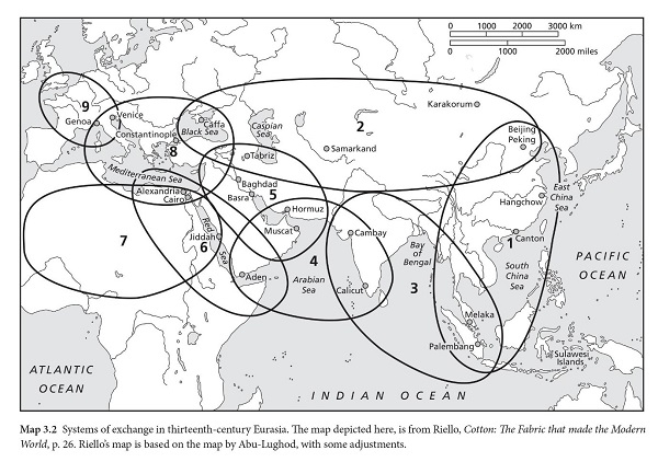)一书中的地图(如上图)。此图显示了跨越地理、文化和政治边界的贸易网,Janet Abu-Lughod把它们分为八个相互重叠的区域。其中,欧洲体系包括从荷兰工业中心布鲁日和根特,南至意大利威尼斯的西欧地区(图中第9);另一个是横跨欧亚大陆的子系统(图中第2);还有一个连接印度洋、马六甲海峡和中国的亚洲子系统(图中第1、3)。划分不同体系的目的不是强调地域差异,相反是展示网络的重叠。在每个单独的系统内,商贾可以较为自由地流动,交易双方对彼此都较为熟悉,系统内的货物需求也比较统一,可以看成一个比较独立的贸易体系。