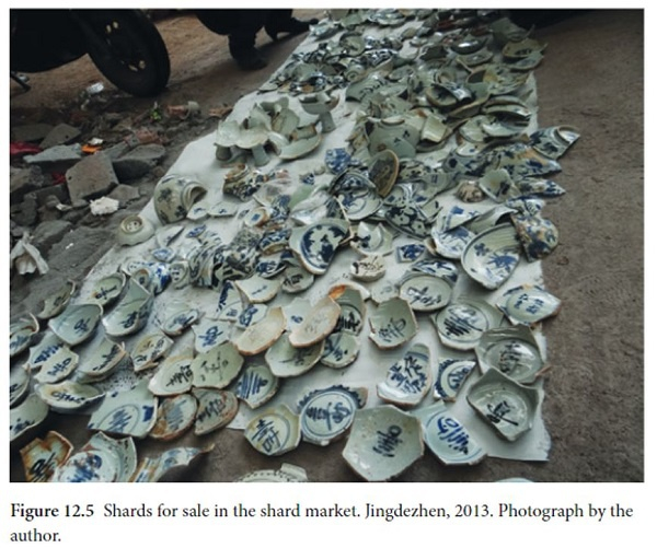第七到十章着重分析十六世纪的景德镇的空间关系,如管理空间、地理空间和烧造空间。通过对地方资源、产品和工匠的管理进行分析,作者认为景德镇大量的市场需求和工匠参与,可以与英国的近代早期工业化(proto-industrialization)进行对比,与大分流的讨论产生对话。第十一章分析十七世纪的贸易情形,下文将详述。第十二章回到现代古瓷市场,展示当今景德镇陶瓷产业面临的诸多问题,比如由于时间和金钱的限制而产生的考古挖掘困难,地方和中央政府对瓷片贩卖的管制不利以及赝品问题。