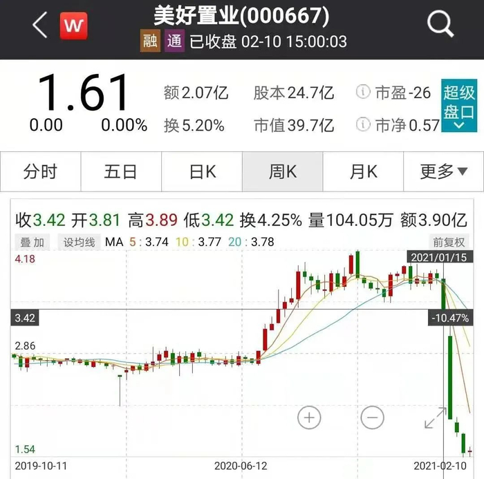 一系列的护盘举措后,美好置业股价艰难小幅反弹,2月10日(农历腊月二十九),春节前的最后一个交易日,公司股价收报1.61元/股。与2020年2月10日相比,公司股价下跌35.34%;与2020年10月22日最高股价4.18元/股相比,公司股价下跌60%。