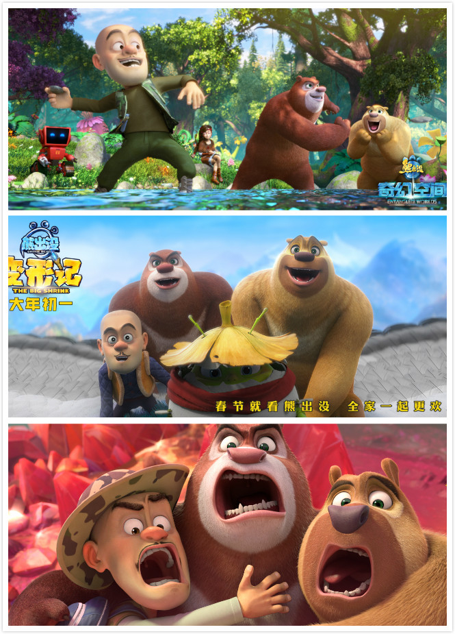 上:《奇幻空间》;中:《变形记》;下:《原始时代》。三部里的光头强,均保留了动画剧集里角色标志性的小撇胡。
