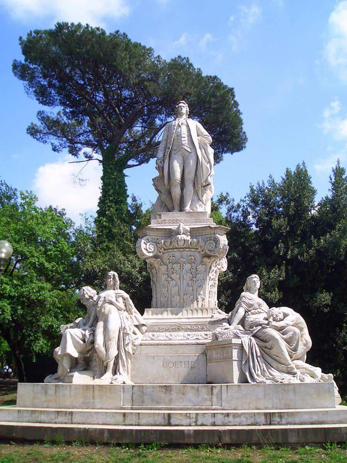 博盖塞别墅外的歌德雕像。歌德于1786年到1788年间旅居意大利,并与康有为一样著有《意大利游记》。此雕像将歌德塑造成其1786年访问罗马时的青年形象。