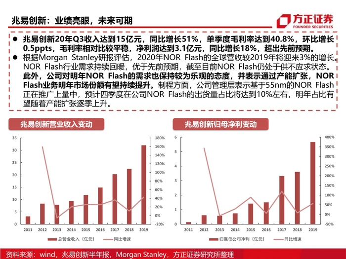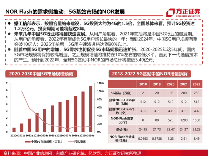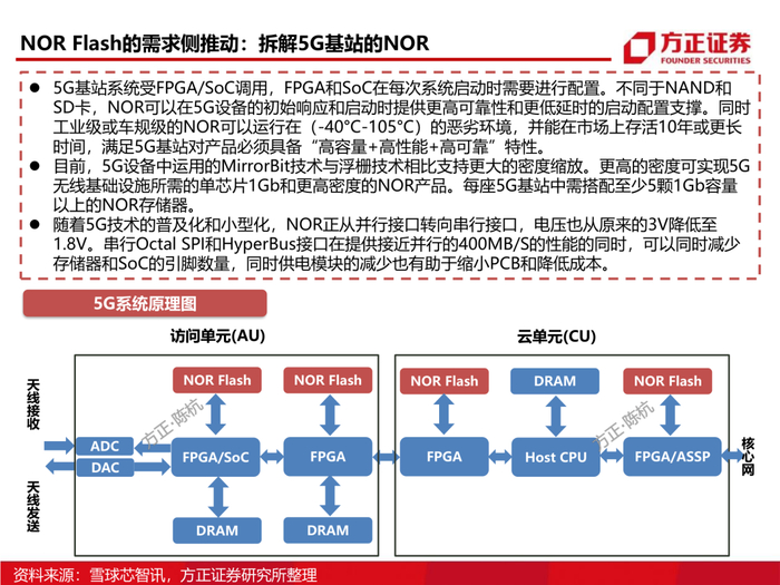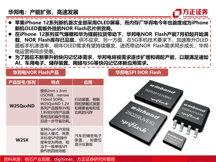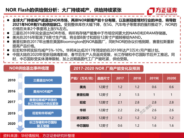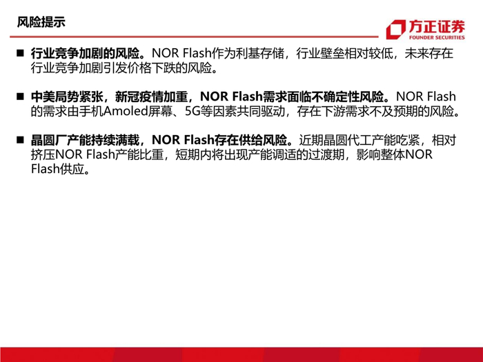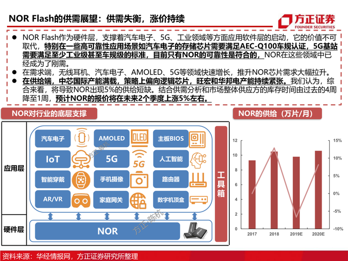 3、从供需格局看NOR Flash:NOR Flash的利基存储器属性决定了它在无线耳机、5G基站等多个领域内无可替代的火热需求,同时伴随晶圆厂的产能吃紧,以及部份产能转向逻辑芯片,我们认为NOR Flash未来的涨价确定性较强。