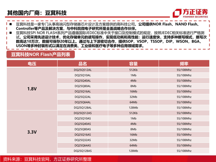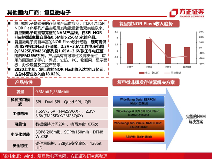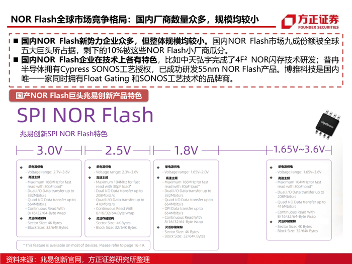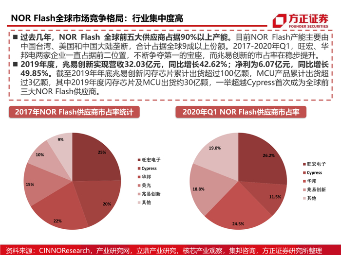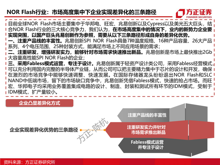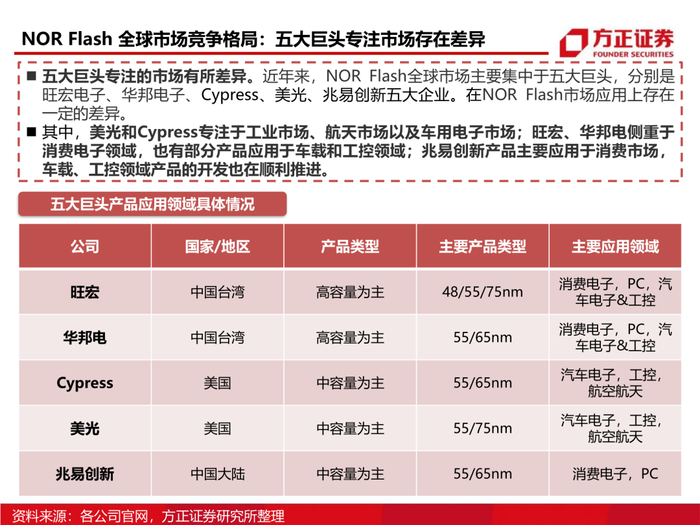 1、从市场属性看NOR Flash市场格局:NOR Flash在存储行业占比仅为1%,过小的市场容量决定了全球存储巨头美光、三星等逐渐退出该行业,但是NOR Flash的特性决定了其重要性不可替代,因此以旺宏电子、华邦电、兆易创新为代表的中国存储企业逐步发展并占据了NOR Flash份额的70%以上。