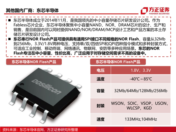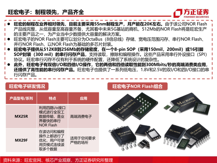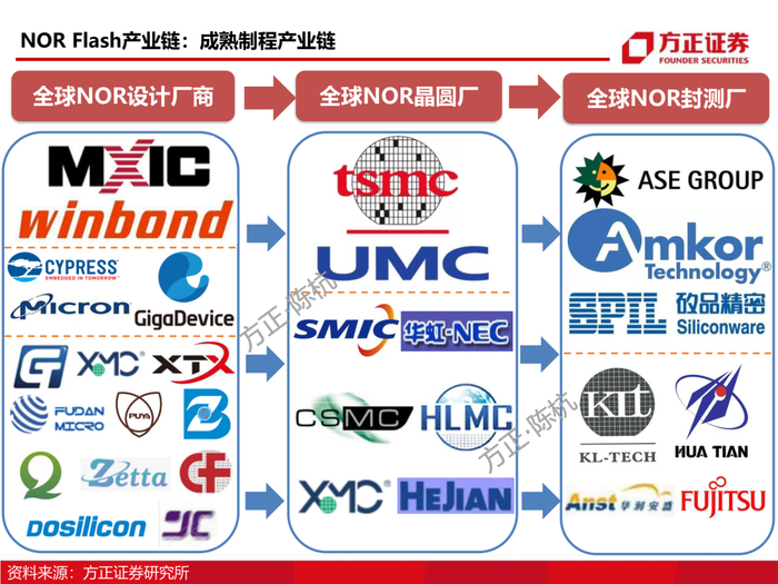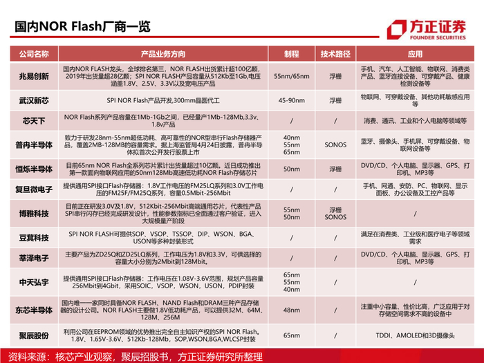 2、从产品制程看NOR Flash产业链:NOR Flash的制程都在45纳米及以上成熟制程,对于成熟制程,国产半导体产业链有足够的能力实现国产替代。