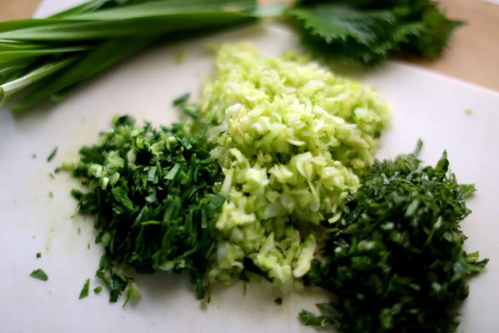 将卷心菜[150克]、韭菜[1把,约50克]和青紫苏[约10枚]洗净切碎。卷心菜和韭菜放入小碗,加适量盐抓匀,出水后挤干水分,再加青紫苏备用。