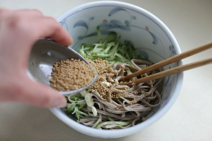 用小锅煮开饮用水,煮面约5—6分钟后用冷水激一下并洗掉面条上的淀粉,让面条更加劲道,然后控水备用。将黄瓜[半根]切丝,加荞麦面[100克]、蛋黄酱[1—2汤匙]、盐[少许]和白芝麻粉[1汤匙],用筷子搅拌。