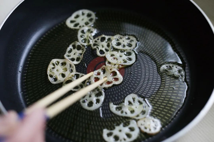莲藕[小块,4—5厘米]洗净后去皮,切成薄片。在小碗里加白醋[少许],将藕片在水中浸泡1分钟。藕片捞出,用厨房纸吸收水分后撒盐备用。预热平底锅加植物油[少许],放入藕片煎炸,炸至两面金黄即可出锅,再用厨房纸吸收多余的油分。