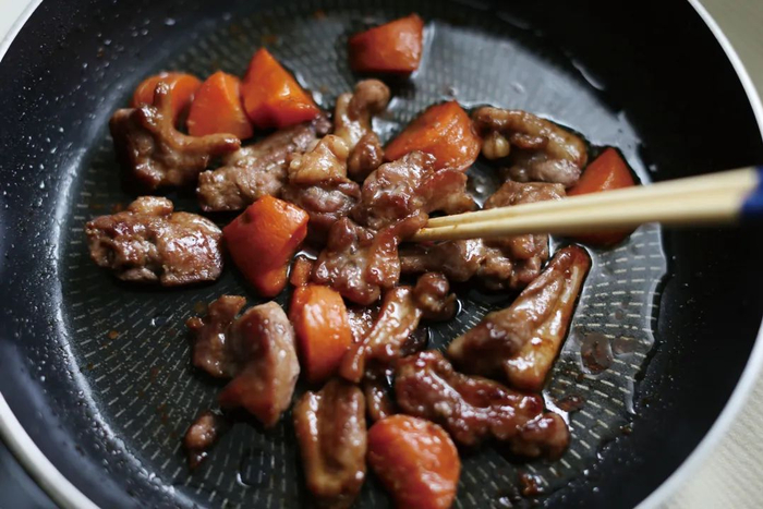 鸭胸肉[1条]和红萝卜[半根]切小块备用。开中火用平底锅煎鸭肉然后放入白糖[1汤匙],鸭肉表皮变色后放入生抽[半汤匙]、料酒[2汤匙]、红萝卜[半根]和生姜。用小火继续加热直到汤汁烧干。食用时按个人口味加七味粉。