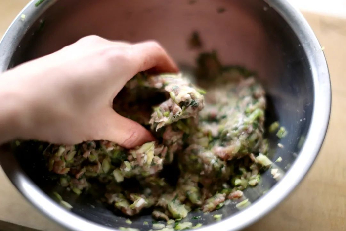 将猪肉馅[150克]充分搅拌,直到变得有劲道、有黏性。接下来将步骤 1 中的蔬菜、 蒜末[1汤匙]、姜末[1汤匙]、生抽[1 汤匙]、芝麻油[半汤匙]、料酒[少许]、白糖[少许]、盐,按个人口味加白胡椒粉后用手搅拌。盖上保鲜膜,放入冰箱半个小时。