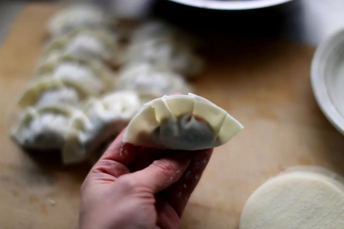 将肉馅放在饺子皮[约30张]中心并对折,用手指蘸水润湿皮的边缘,用手将右半边饺子皮的边缘捏一个小波浪,然后捏紧,再往左继续捏 6—7 个小波浪,直到封口。
