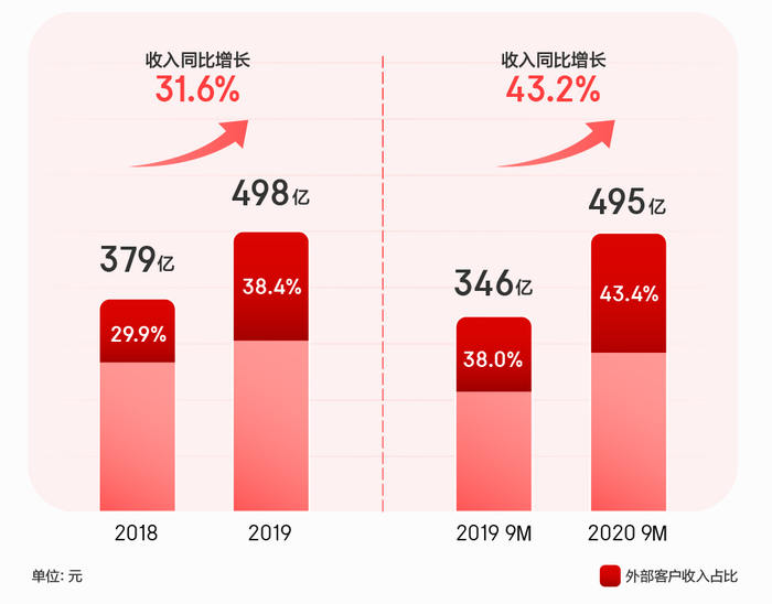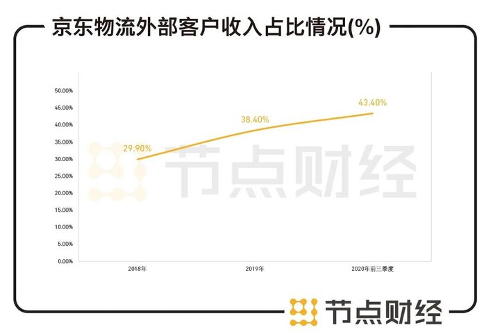 从京东物流独立运营开始,其外部客户收入的占比就不断提升。招股书显示,京东物流外部客户收入占比从2018年的29.9%、2019年的38.4%提升至2020年前9个月的43.4%。