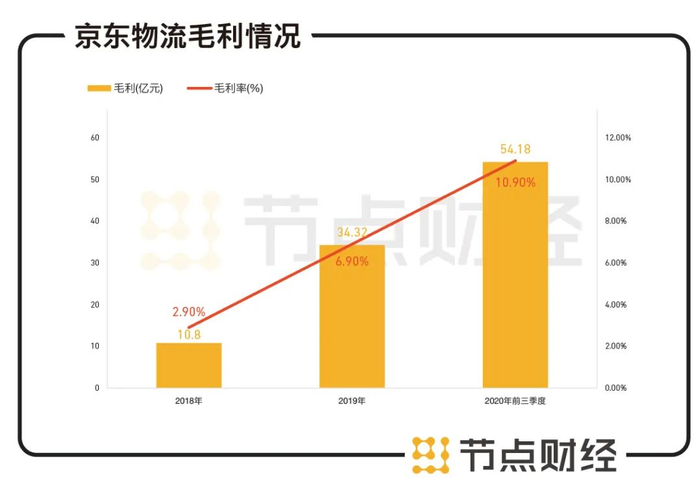 京东物流2018年、2019年毛利分别为10.8亿元、34.32亿元;2020年前9个月毛利为54.18亿元,上年同期毛利为20.43亿元。