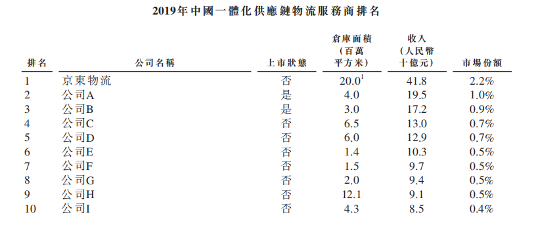 根据灼识咨询报告显示,2019年按收入计排行前十的企业仅占7.9%的市场份额。排行前十的企业中,京东物流是最大的一体化供应链物流服务商,2019年,市场份额为2.2%。