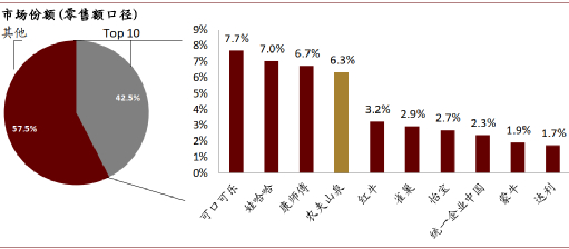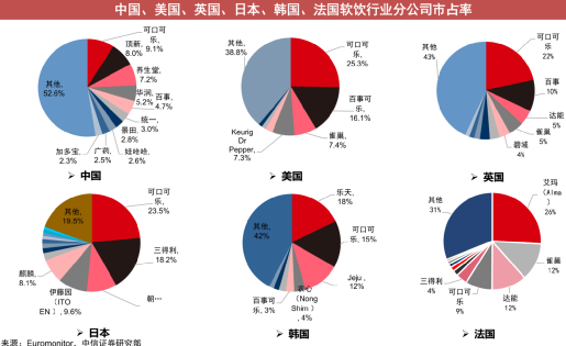 中国软饮行业的头部集中程度是大国中最低的,TOP 10的市占率是大国唯一没超过一半的。