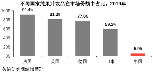 2019年,法国纯果汁占比高达91.4%,英国占比达到81.3%,日本也有近六成,而我们不到6%,说明还有很长的路要走。