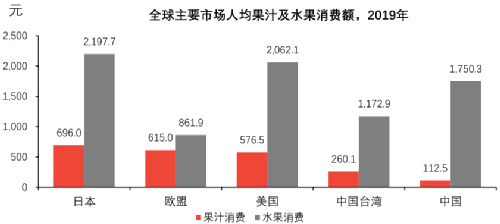 中国人均每年花在水果上的钱达到1750元,接近日本和美国的人均水平,但果汁消费只有112.5元,是他们的1/5以下。