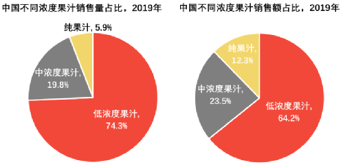 根据头豹研究院的数据,2017-2019年,中国中高浓度果汁年复合增长率达到14.9%——2019年销量占1/4,销售额却能占到1/3以上。
