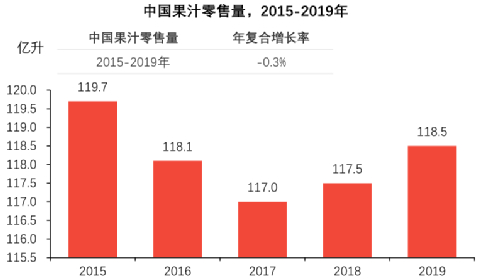 这几年果汁行业呈现出一个变化,就是卖的量越来越少(年复合增长 -0.3%),销售额却缓慢攀升,达到1219.7亿元,预计3年以后会接近1500亿元的规模。