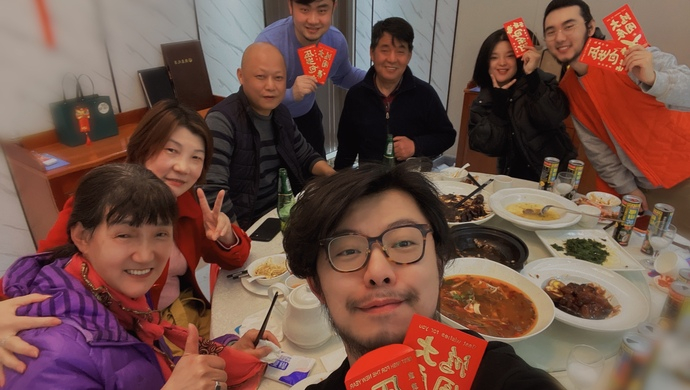 坐在芳芳身边的,还有两位同事——辽宁人伟伟和上海人冬冬。他们三人都是听障者,在“老板”蔡振君的召集下,目前经营着一家花艺工作室。今年春节,工作室团队留沪,蔡振君知道他们在上海没什么朋友,便都邀请到自己家过年。一桌年夜饭里,有川菜、东北菜和上海菜。