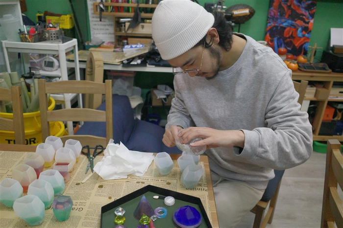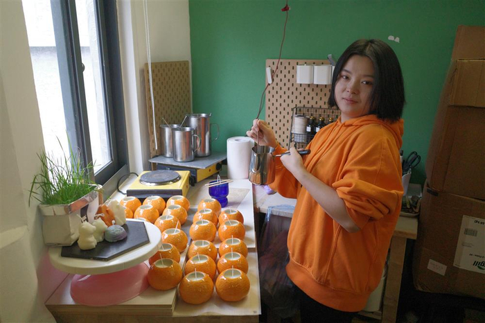 春节前,工作室在上海中心地下一楼参加迎新花市,货架上摆满了颜色造型各异的插花、香皂、蜡烛。中午饭点刚过,写字楼里的白领们趁着午休时间都涌过来采购,现场只有冬冬一人在看摊,通过手机打字和顾客交流,摊位前秩序井然。