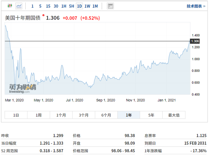 5、2月17日,美国10年期国债收益率升至近一年新高。